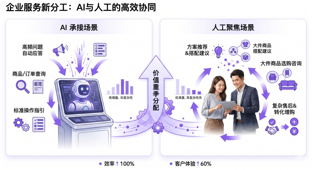 提升人工服务能力:基础咨询被分流后,人工客服就能把更多时间投入到高价值咨询和客户关系维护中。